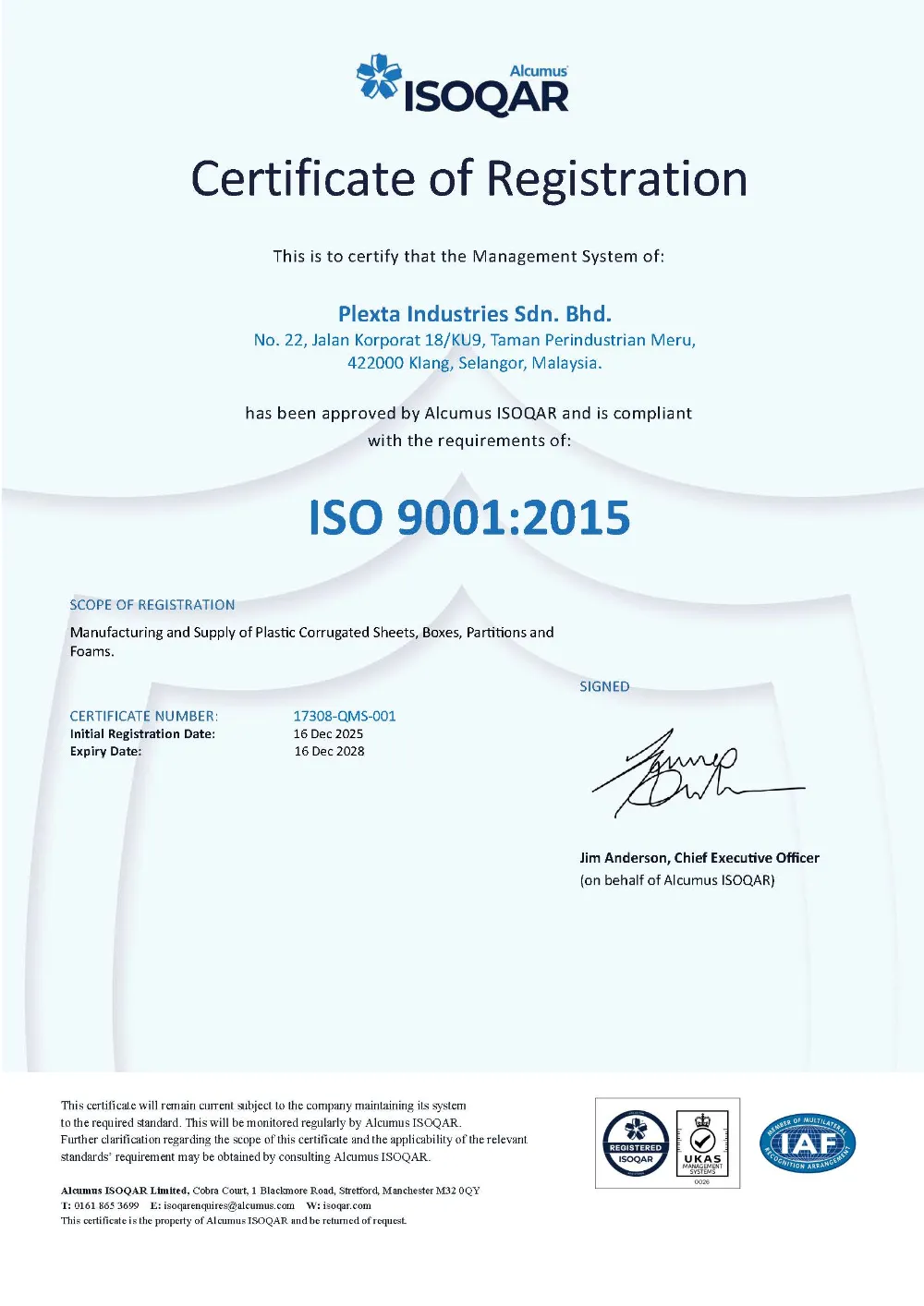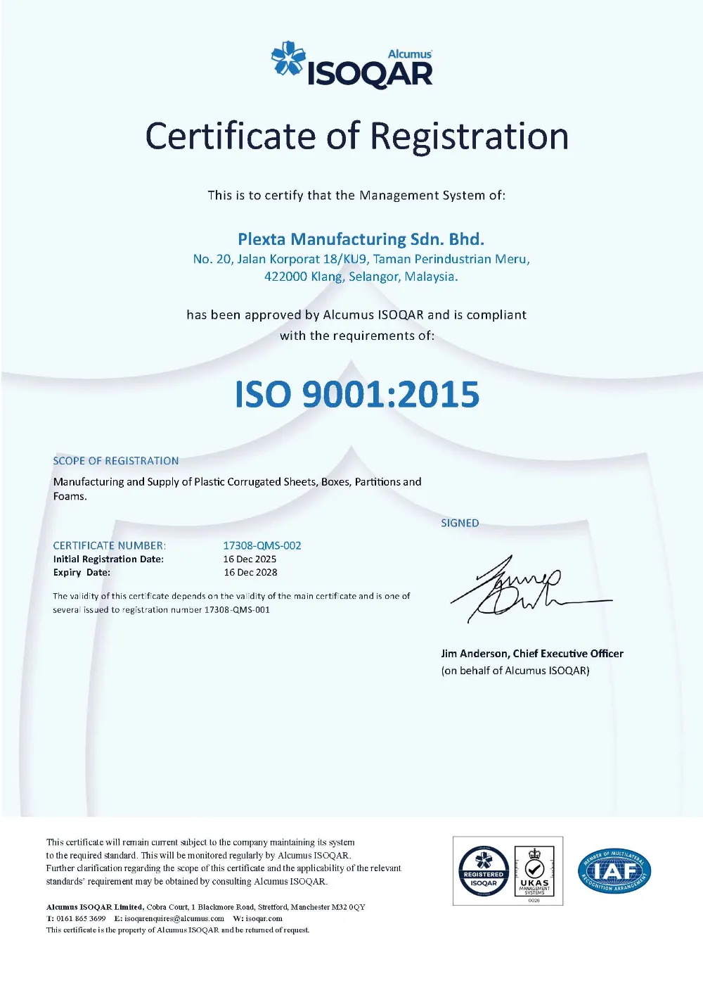 At Plexta Industries Sdn Bhd, quality is at the core of everything we do. We are proud to be ISO 9001 certified, demonstrating our unwavering commitment to maintaining the highest standards in our manufacturing processes and product offerings.